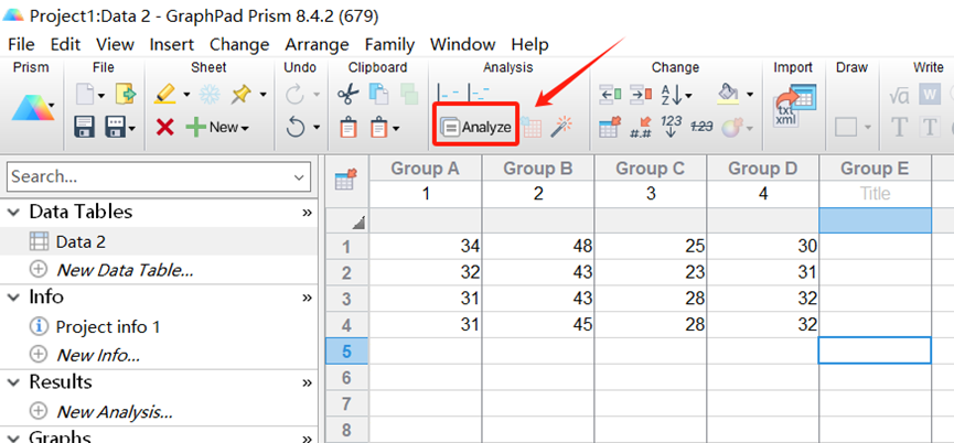 示例:有4组数据,每组都有4个样本,这种单变量的多组数据之间的比较适用One-way ANOVA检验。若是双变量的多组数据则适用于TWO-way ANOVA检验。若是只有两组,适用于t-test检验。
