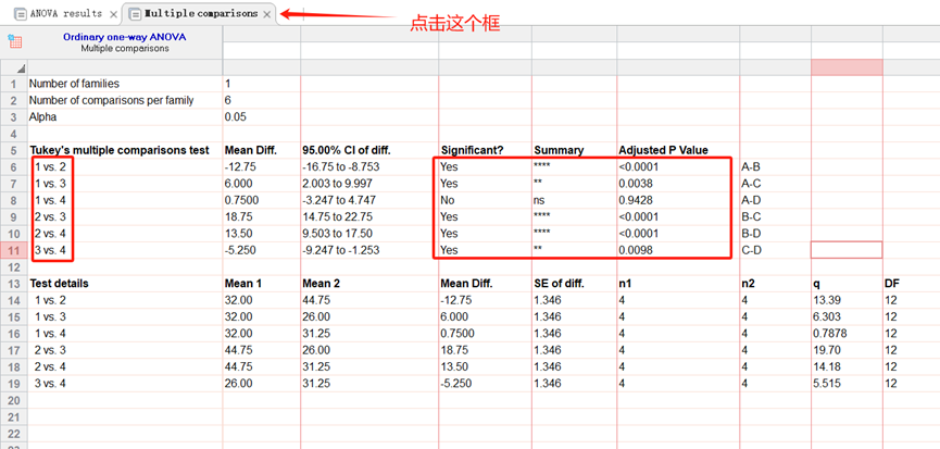 点击Multiple Comparisons表,看P值就可以看到组与组之间的数据是否显著了,1和2,3都显著,1和4不显著,2和3,4都显著,3和4显著。