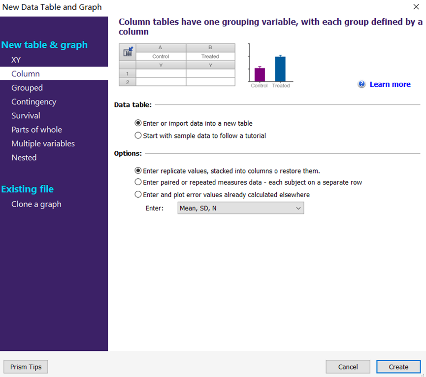 打开prism,选择以下界面,Mean,SD,N代表均值,标准差,重复个数。