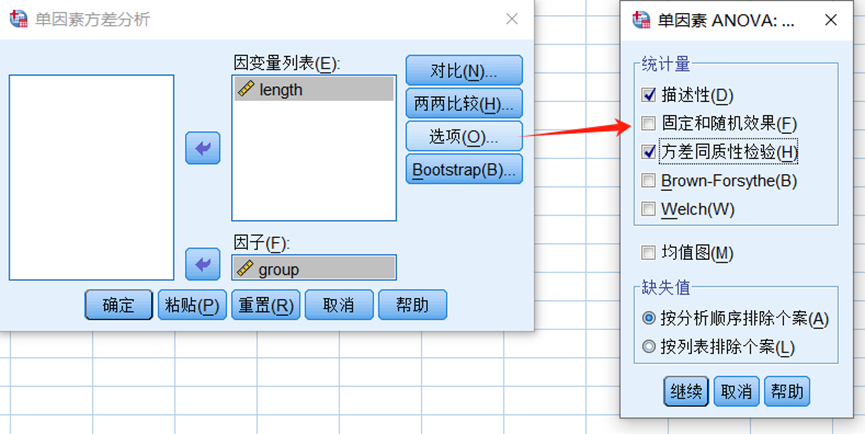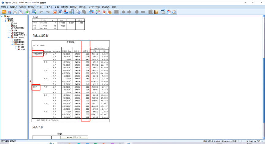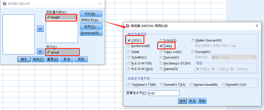 因变量为length,因子为group,两两比较,选择LSD和Turkey。