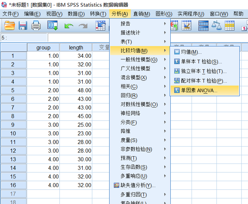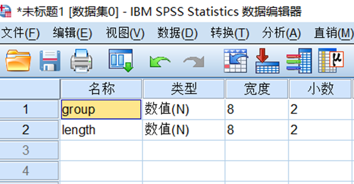 接下来是SPSS软件计算显著性,其实和prism是一样的,使用随便一种都可以,只是prism更方便些,还能顺便把图给做了。在变量视图中,输入两个变量,名为group和length。