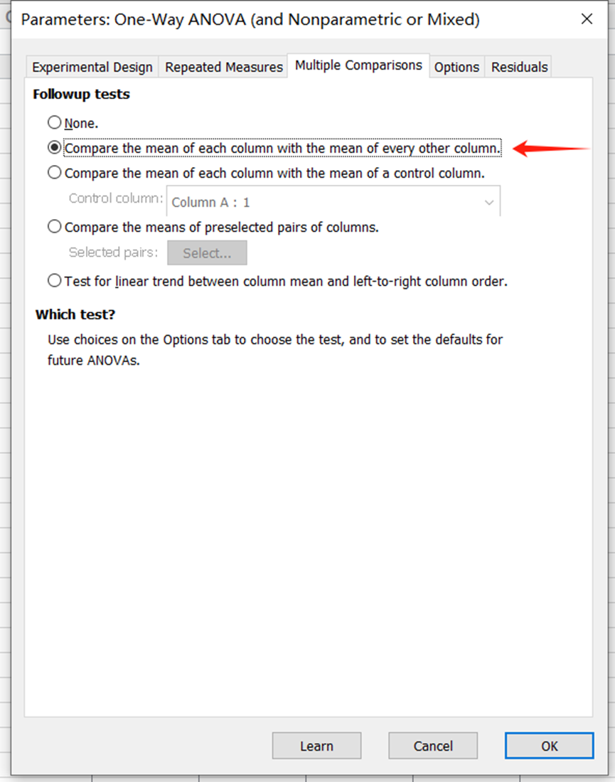 在弹出的界面,Multiple Comparisons中选择Compare the mean of each column with the mean of every other column,就是每组之间都相互比较。再点旁边的options可以看到是推荐Turkey算法。