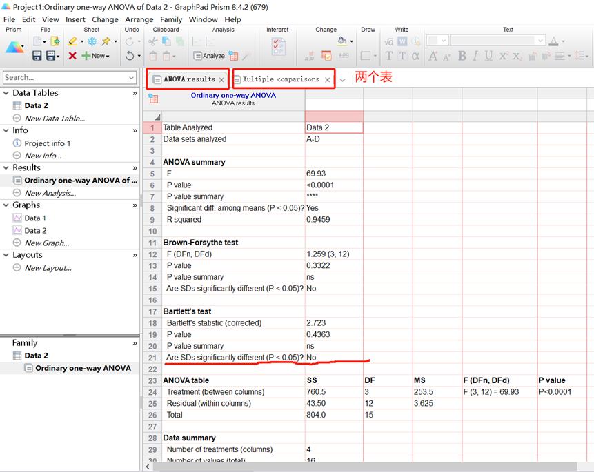 出来了两个表,一个是ANOVA表,一个是Multiple Comparisons表。其中ANOVA表中,有个需要注意的,Are SDs significantly different (P < 0.05)? No,问各组的标准差有没有显著性差异,若没有,则说明这个ANOVA的计算是可以用。