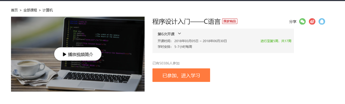 1.注册中国大学Mooc,并参加浙江大学的”程序设计入门-C语言课程“,要求截图。