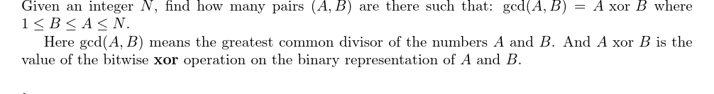 满足\(1 \le b \le a \le n\)且\(gcd(a,b)==a \oplus b\)的\((a,b)\)二元组个数。