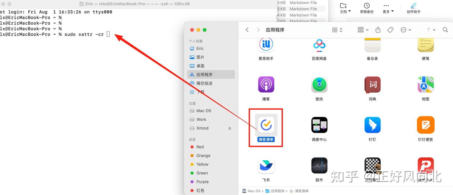 然后打开「应用程序文件夹」,把滴答清单应用拖到终端里面,就会自动补全后半部分的命令(其实就是滴答清单应用程序的路径)