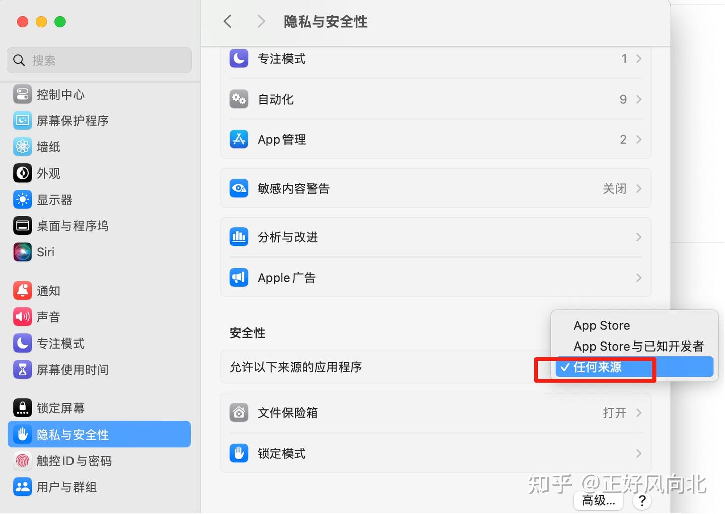 运行命令后,会在 系统偏好设置 – 安全性与隐私 – 安全性 ,中显示“任何来源”选项,如下图,需要勾选上「任何来源」