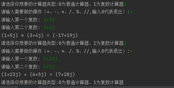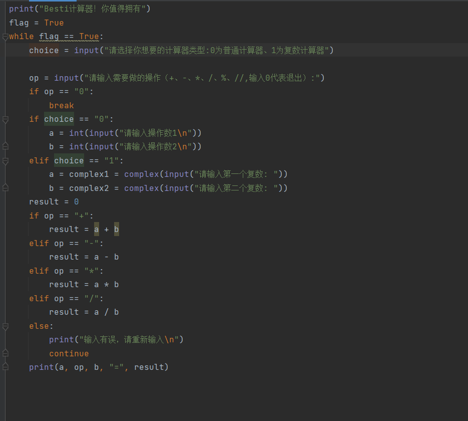 根据老师的演示,编写出了可以计算实数和复数的四则运算的计算器。