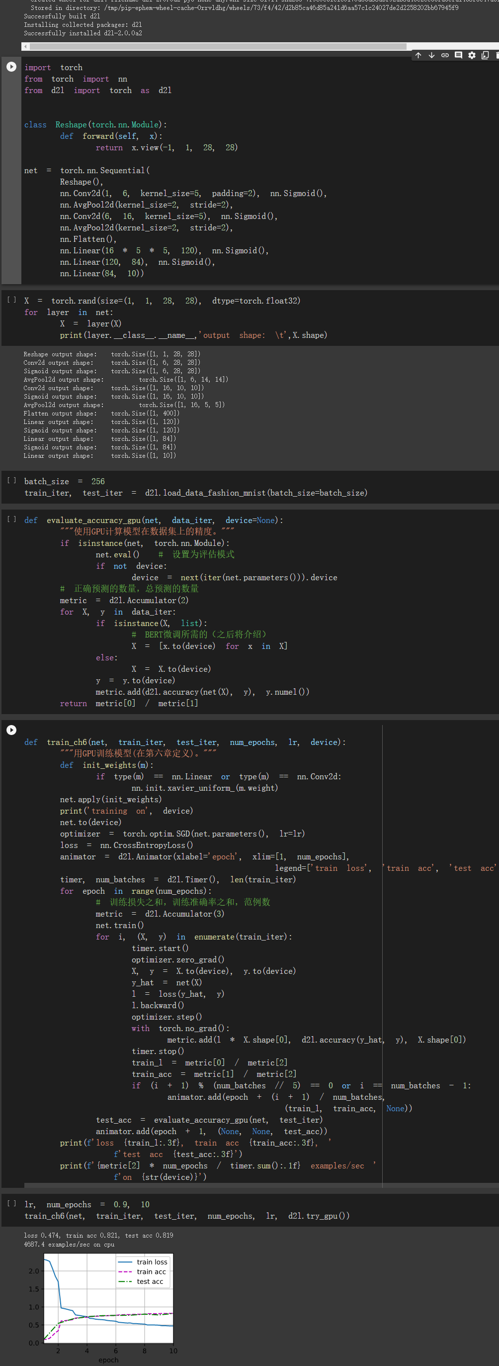 class Reshape(torch.nn.Module): def forward(self, x): return x.view(-1, 3, 224, 224) net = torch.nn.Sequential( Reshape(), nn.Conv2d(3,16,5,2,2),#输入三通道,输出16通道,k为5*5,步长是2,填充也是2 nn.Sigmoid(),#激活函数,112 nn.Conv2d(16,32,5,2,2), nn.Sigmoid(),#56 nn.Conv2d(32,32,3,1,1),#不变 nn.Sigmoid(), nn.Conv2d(32,32,3,1,1), nn.Sigmoid(), nn.AvgPool2d(kernel_size=2, stride=2),#平均池化层 28 nn.Conv2d(32,32,3,1,1), nn.Sigmoid(), nn.Conv2d(32,32,3,1,1), nn.Sigmoid(), nn.AvgPool2d(kernel_size=2, stride=2),#14 nn.Conv2d(32,32,3,1,1), nn.Sigmoid(), nn.Conv2d(32,32,3,1,1), nn.Sigmoid(), nn.AvgPool2d(kernel_size=2, stride=2),#7 nn.Conv2d(32,32,3,1,1), nn.Sigmoid(), nn.Conv2d(32,32,3,1,1), nn.Sigmoid(), nn.AvgPool2d(kernel_size=2, stride=2),#3
