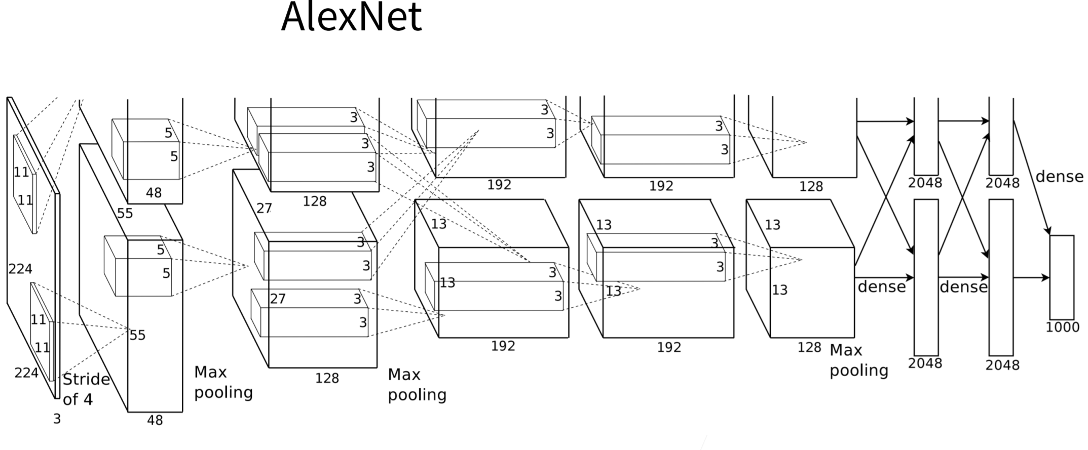 在AlexNet的第一层,卷积窗口的形状是 11×11。 由于ImageNet中大多数图像的宽和高比MNIST图像的多10倍以上,因此,需要一个更大的卷积窗口来捕获目标。 第二层中的卷积窗口形状被缩减为 5×5,然后是 3×3。 此外,在第一层、第二层和第五层卷积层之后,加入窗口形状为 3×3、步幅为2的最大汇聚层。 而且,AlexNet的卷积通道数目是LeNet的10倍。