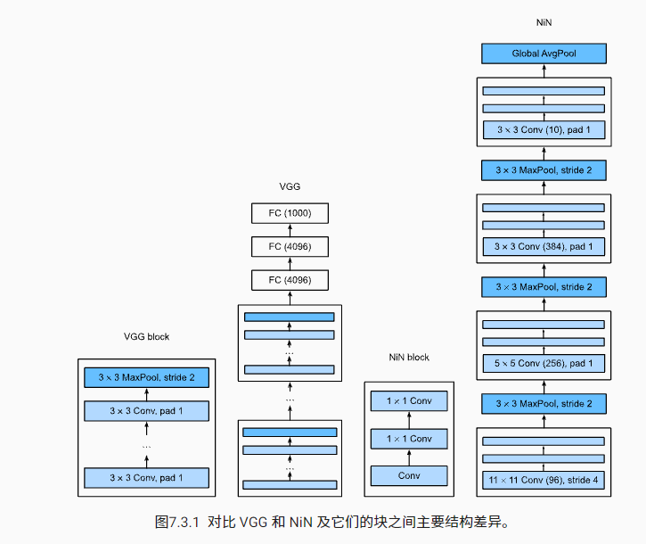 NiN使用由一个卷积层和多个 1×1卷积层组成的块。该块可以在卷积神经网络中使用,以允许更多的每像素非线性。