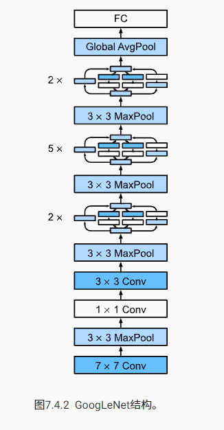 GoogLeNet 一共使用 9 个Inception块和全局平均汇聚层的堆叠来生成其估计值。Inception块之间的最大汇聚层可降低维度。 第一个模块类似于 AlexNet 和 LeNet,Inception块的栈从VGG继承,全局平均汇聚层避免了在最后使用全连接层。