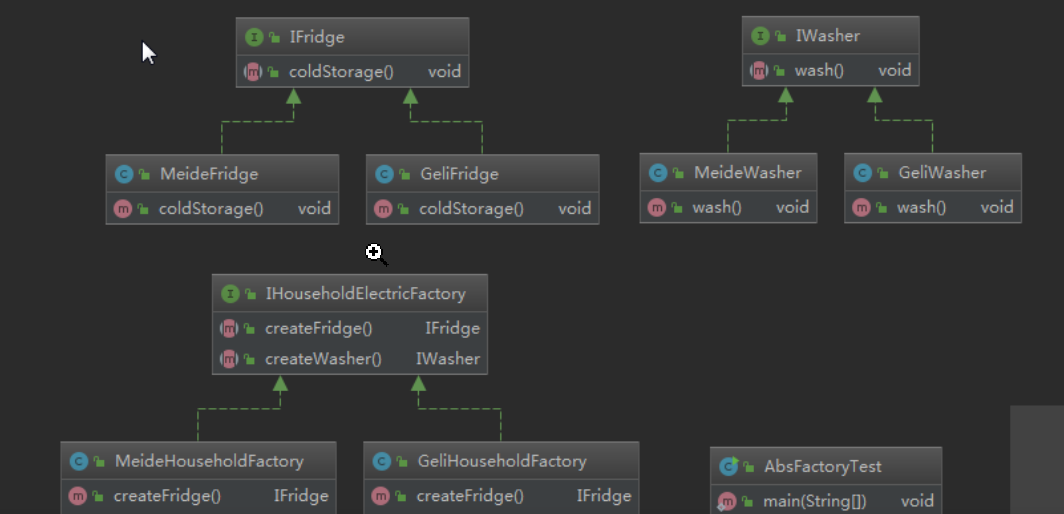 1 public class MeideHouseholdFactory implements IHouseholdElectricFactory{ 2 @Override 3 public IFridge createFridge() { 4 return new MeideFridge(); 5 } 6 7 @Override 8 public IWasher createWasher() { 9 return new MeideWasher(); 10 } 11 } 12 13 public class GeliHouseholdFactory implements IHouseholdElectricFactory{ 14 @Override 15 public IFridge createFridge() { 16 return new GeliFridge(); 17 } 18 19 @Override 20 public IWasher createWasher() { 21 return new GeliWasher(); 22 } 23 }