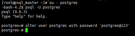 #yum安装postgresql,默认会建一个名为”postgres”的系统账号,用于执行PostgreSQL; [root@psql_master ~]# su - postgres #切换用户后,提示符变更为“-bash-4.2$”; #同时数据库中也会生成一个名为”postgres”的数据库用户,且密码已自动生成; #PostgreSQL在数据库用户同名的系统账号下登录免密; -bash-4.2$ psql -U postgres #进入数据库后修改密码; postgres=# alter user postgres with password 'postgres@123'