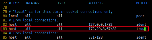 #在第82行之后,”IPv4 local connections”下新增允许的客户端; #“host” 代表主机类型,第一个“all”代表db ,第二个“all”代表user ,“172.29.3.67/32” 代表client ip,“trust”代表认证方式; #认证方式除“trust”外,还有“peer”, “ident”, “md5”, “password”等,具体可参考pg-hba文件: https://www.postgresql.org/docs/current/static/auth-pg-hba-conf.html #修改pg.hba文件需要重启服务。 [root@psql_master ~]# vim /var/lib/pgsql/9.6/data/pg_hba.conf host all all 172.29.3.67/32 trust![]()