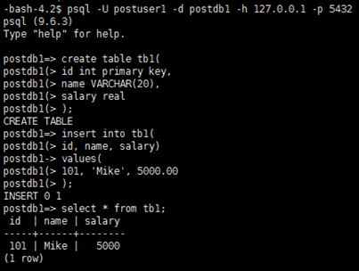 postdb1=> create table tb1( id int primary key, name VARCHAR(20), salary real ); - 插入数据