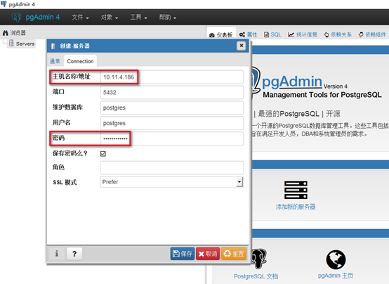 打开pgadmin—>添加新的服务器—>(通常标签)名称自定义—>(connection标签)主机名称与postgresql用户密码按需填写,其余可采用默认配置—>保存