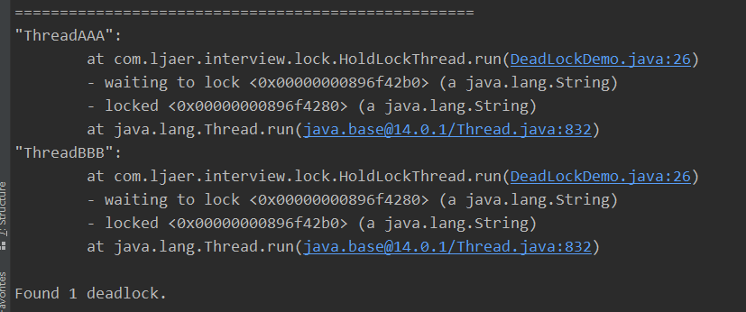 package com.lzz.interview.lock; /* * 死锁是指两个或者两个以上的进程在执行过程中,因抢夺资源而造成的一种互相等待的现象, * 若无外力干涉它们将都无法推进下去,如果系统资源充足,进程的资源请求都能够得到满足, * 死锁出现的可能性也就很低,否则就会因争夺有限的资源而陷入死锁。 * */ import java.util.concurrent.TimeUnit; class HoldLockThread implements Runnable{ private String lockA; private String lockB; public HoldLockThread(String lockA,String lockB){ this.lockA = lockA; this.lockB = lockB; } public void run(){ synchronized (lockA){ System.out.println(Thread.currentThread().getName()+"\t自己持有:"+lockA+"\t尝试获得:"+lockB); //暂停一下 try{ TimeUnit.SECONDS.sleep(2); }catch (InterruptedException e){e.printStackTrace();} synchronized (lockB){ System.out.println(Thread.currentThread().getName()+"\t自己持有:"+lockB+"\t尝试获得:"+lockA); } } } } public class DeadLockDemo { public static void main(String[] args){ String lockA = "lockA"; String lockB = "lockB"; new Thread(new HoldLockThread(lockA,lockB),"ThreadAAA").start(); new Thread(new HoldLockThread(lockB,lockA),"ThreadBBB").start(); /* * linux ps -ef|grep xxxx ls -l查看当前进程的命令 * windows下的java运行程序,也有类似ps的查看进程的命令,但是目前我们需要查看的只是java * jps = java ps jps -l * jstack * */ } }