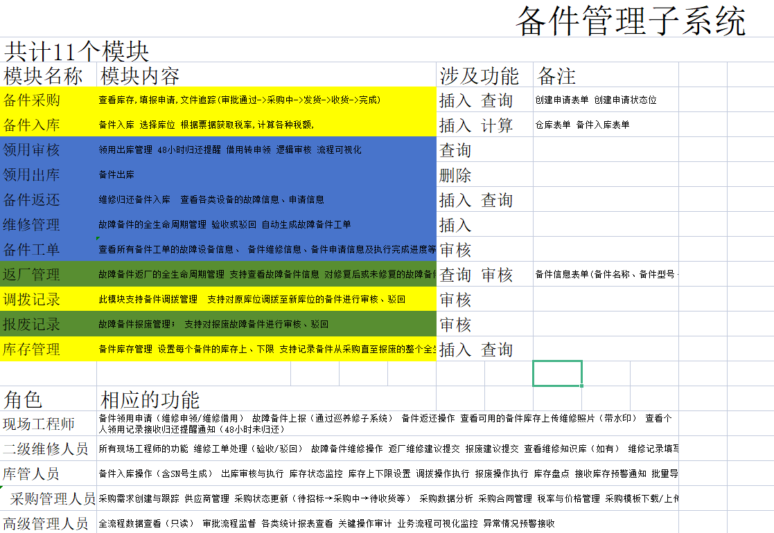 这四个模块均围绕备件"入口"和库存状态管理,涉及供应链全流程。由同一人负责可确保采购→入库→库存→调拨的数据一致性,减少沟通成本。