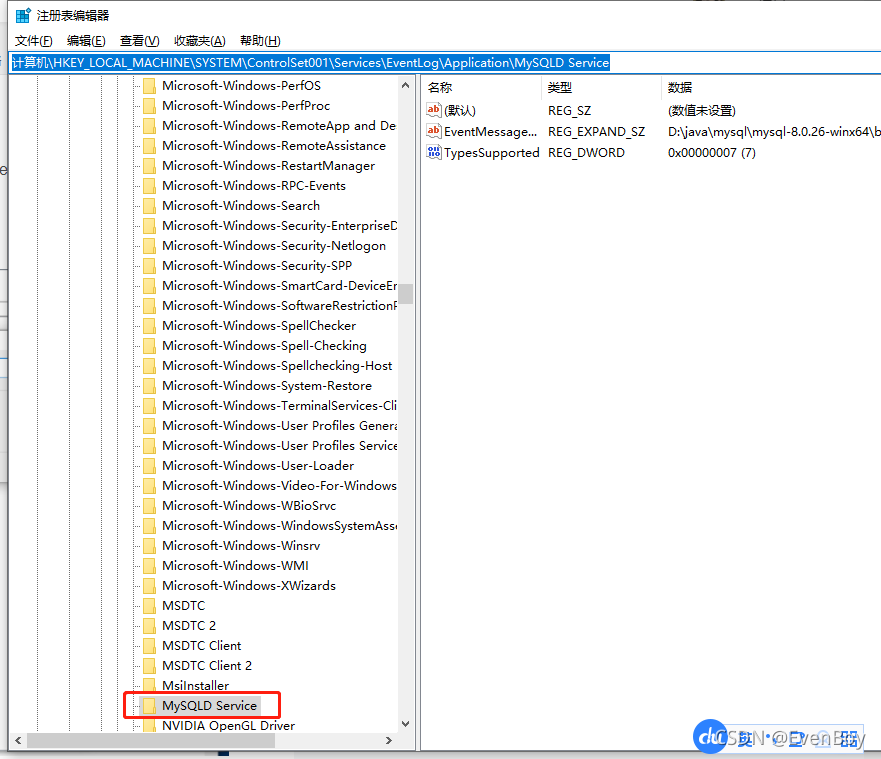 找到mysql注册表的路径目录右键删除:计算机\HKEY_LOCAL_MACHINE\SYSTEM\ControlSet001\Services\EventLog\Application\MySQLD Service