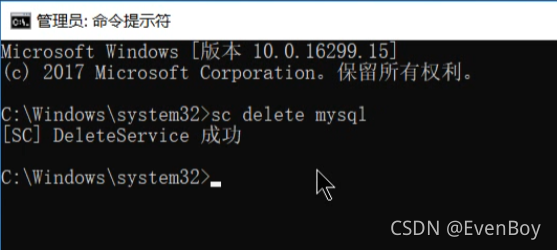 2、输入sc delete mysql 移出mysql服务 (前提是需要配置mysql的环境变量 否则需要进入到mysql目录下才能运行该命令)