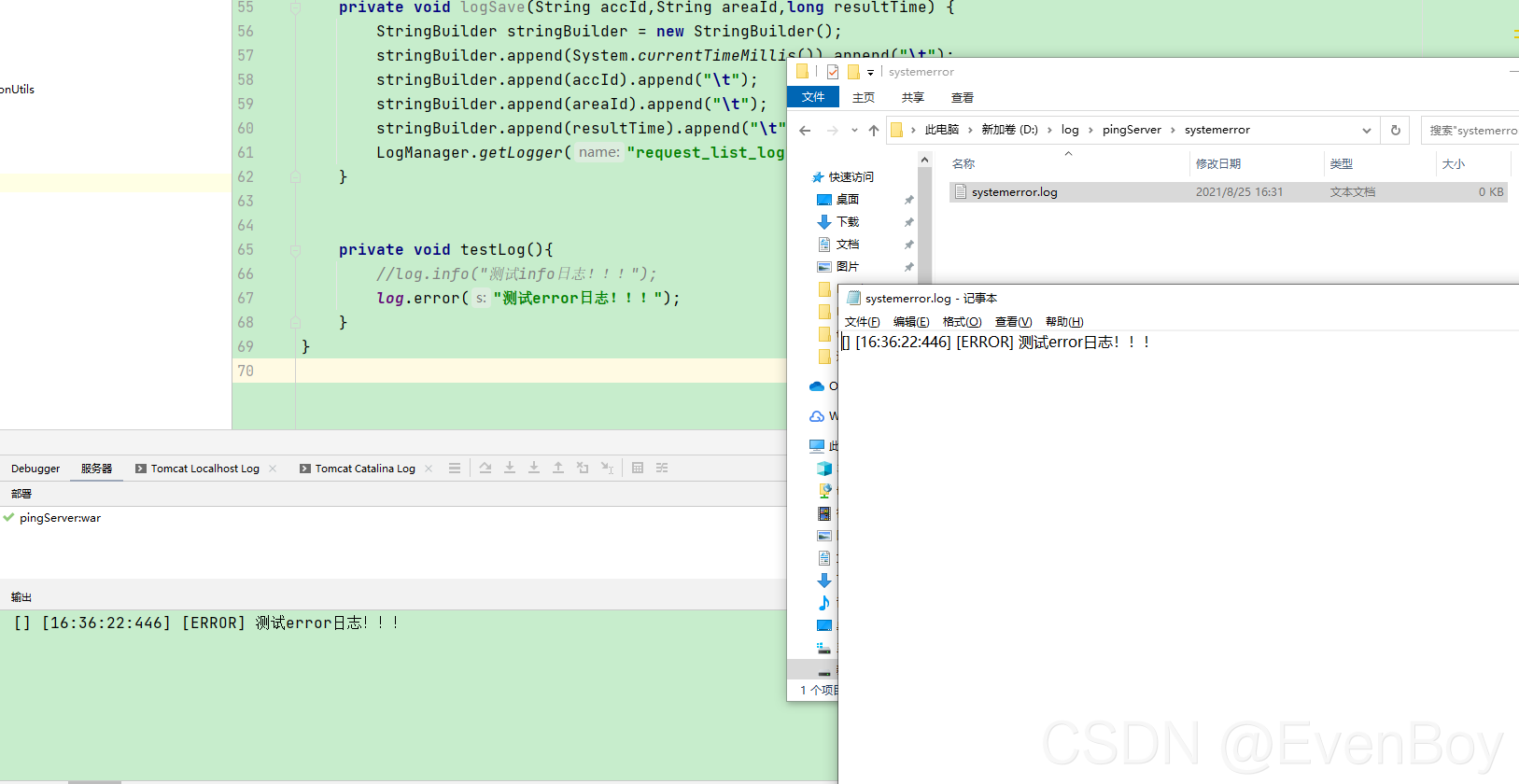 2、error级别 打印日志的路径(D:\log\pingServer\systemerror)