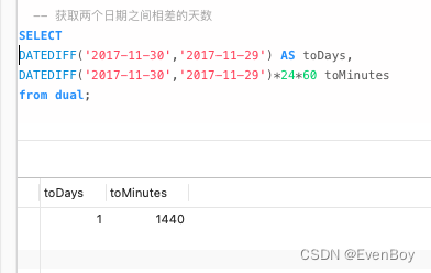 SELECT DATEDIFF('2017-11-30','2017-11-29') AS toDays from dual;