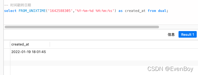 select FROM_UNIXTIME('1642588305','%Y-%m-%d %H:%m:%s') as created_at from dual;