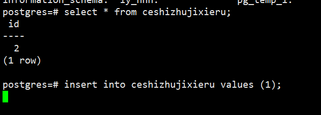 postgres=# select * from ceshizhujixieru; id ---- 2 (1 row)