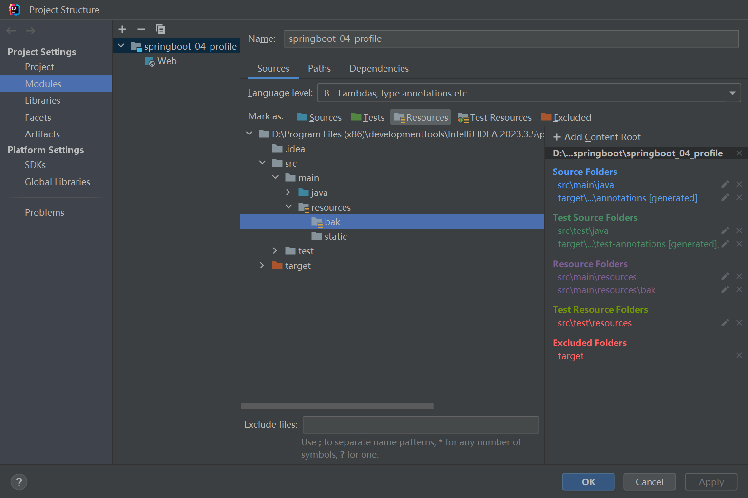 在project structure中打开molude,打开resource,选中其下不起作用的文件夹,如图中的bak,将其选为resource资源文件,即点击下图位置