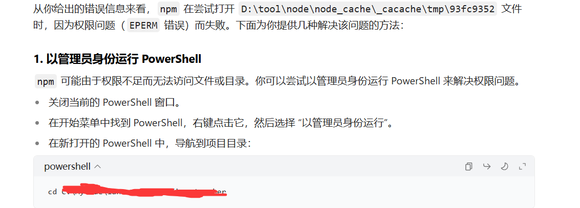 从你给出的错误信息来看,npm 在尝试打开 D:\tool\node\node_cache_cacache\tmp\93fc9352 文件时,因为权限问题(EPERM 错误)而失败。下面为你提供几种解决该问题的方法: