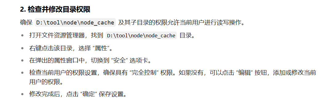 确保 D:\tool\node\node_cache 及其子目录的权限允许当前用户进行读写操作。