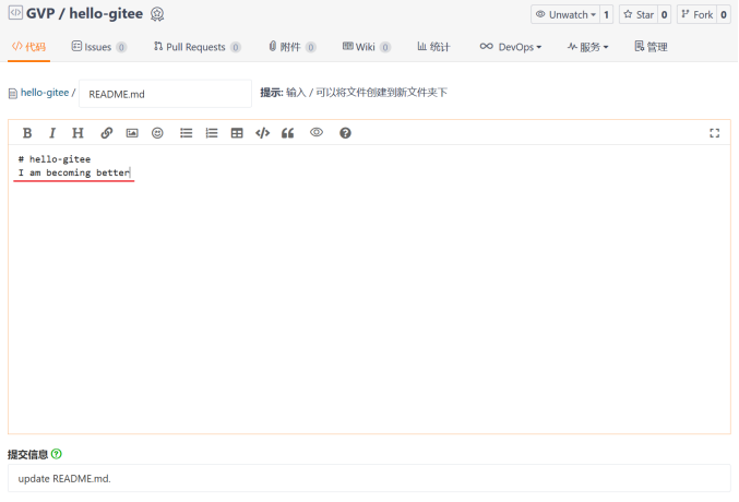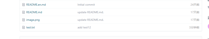 此时,新建的仓库中会有 README.en.md 及 README.md 两个默认 Markdown 格式的文档。我们将在 README.md 文档上进行后续操作。
