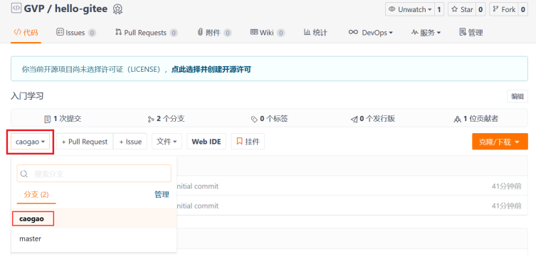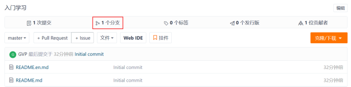 点击下图中的“1个分支”进入分支管理界面