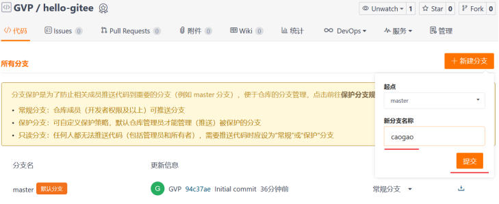 点击右上角“新建分支”按钮,命名“新分支名称”为:caogao,点击“提交”按钮确认
