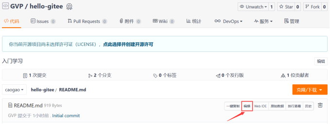 点击 caogao 分支的READ.md 文档,如下图位置点击“编辑”按钮