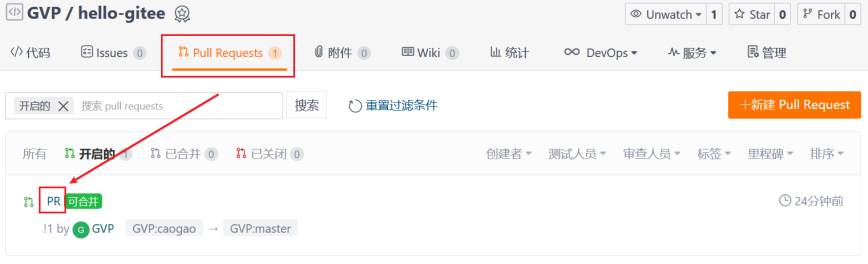 进入 Pull Requests 页面,点击可合并的请求。