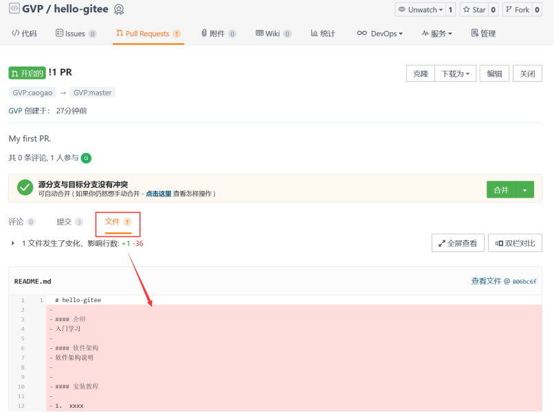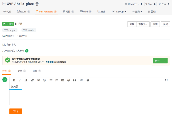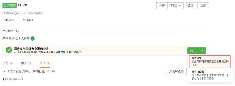 点击右下角创建,首个 Pull Requests 就创建完成了!