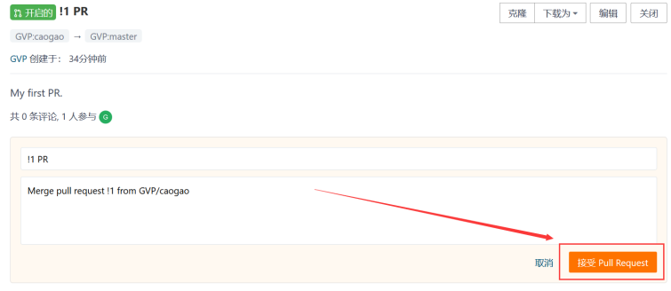 命名本次操作:PR,在文本框中填入备注信息:My first PR.