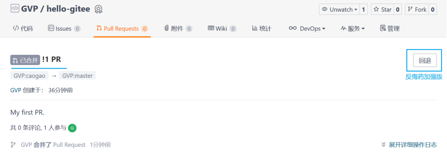 合并完成后显示为“已合并”,但Gitee依旧提供了强力后悔药“回退”功能(手快不用愁)