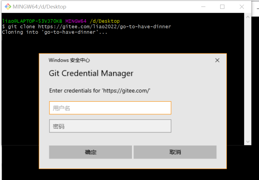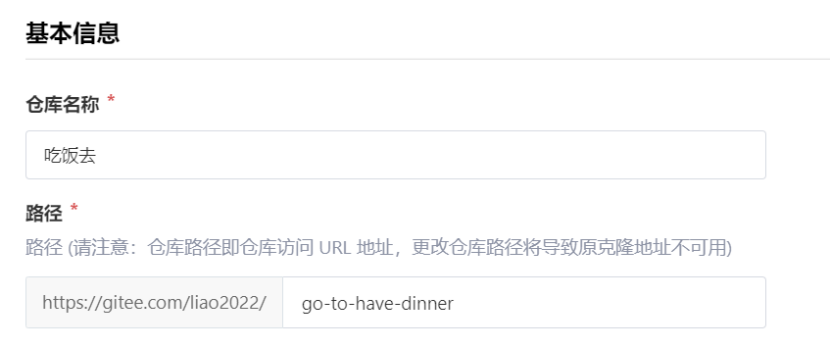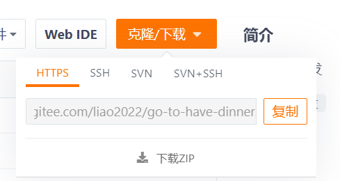 首先进行git安装,之后创建远程代码仓库。例如在gitee上创建了项目“吃饭去”,每个远程代码库都有一个自己的url: