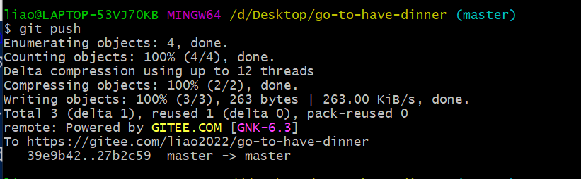 这里可以直接使用git push命令,因为远程创建了代码仓库,git默认关联的库在远程,git push是默认推送到远程库master分支。