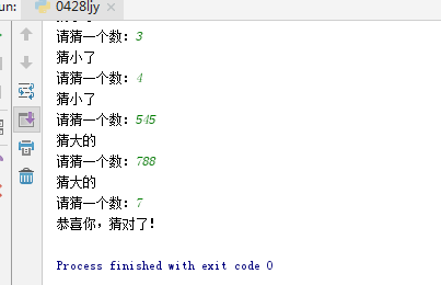myNum = 7 print('猜数字游戏\n') while True: guess = int(input('请猜一个数:')) if guess > myNum: print('猜大的') elif guess < myNum: print('猜小了') else: print('恭喜你,猜对了!') break