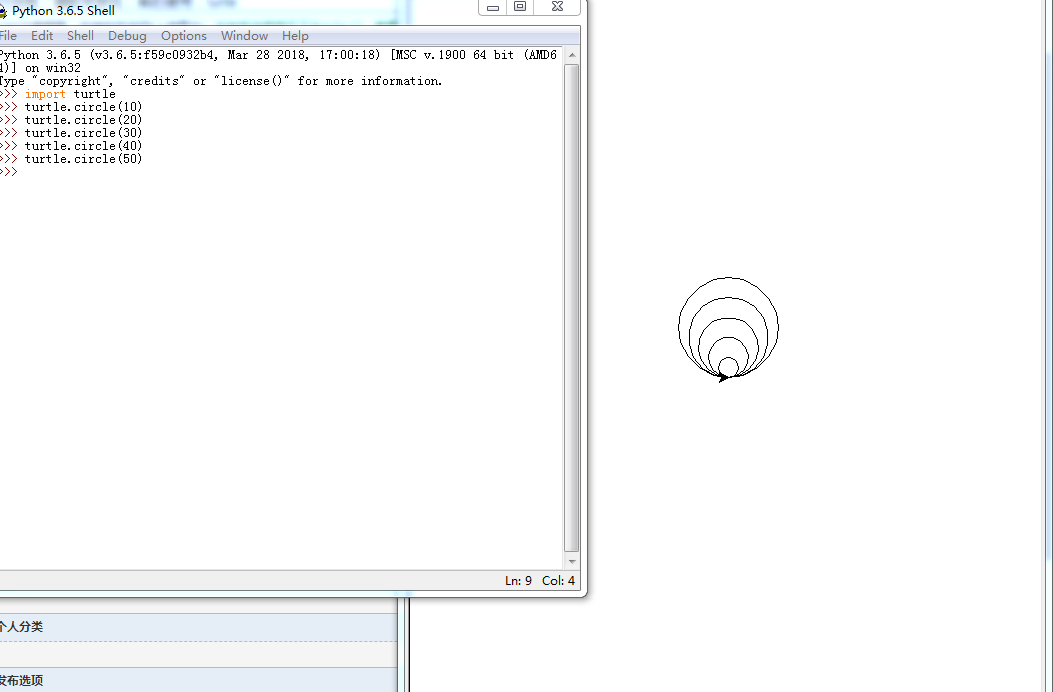 >>> import turtle >>> turtle.circle(10) >>> turtle.circle(20) >>> turtle.circle(30) >>> turtle.circle(40) >>> turtle.circle(50) >>>