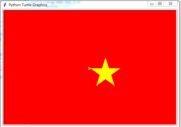 import turtle turtle.setup(600,400,0,0) turtle.bgcolor('red') turtle.color("yellow") turtle.fillcolor("yellow") turtle.begin_fill() for i in range(5): turtle.forward(100) turtle.right(144) turtle.end_fill() turtle.done()
