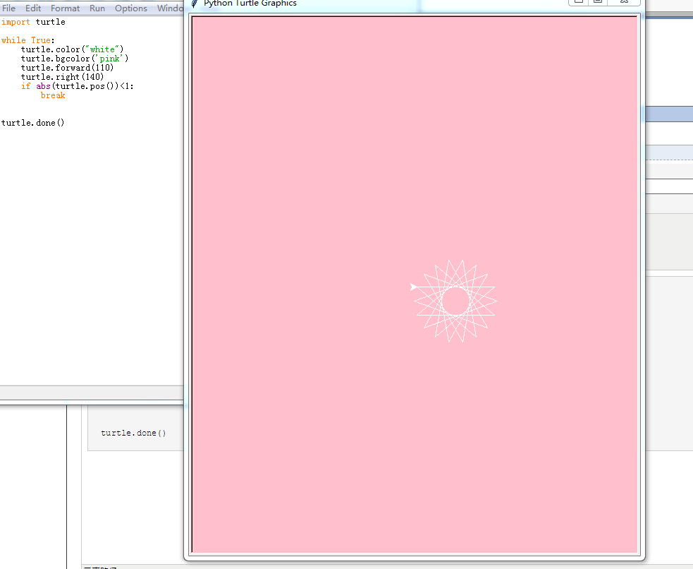 import turtle while True: turtle.color("white") turtle.bgcolor('pink') turtle.forward(110) turtle.right(140) if abs(turtle.pos())<1: break turtle.done()