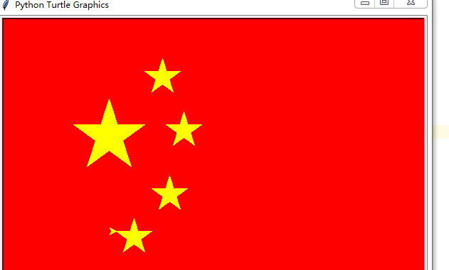 import turtle turtle.setup(600,400,0,0) turtle.bgcolor('red') turtle.color('yellow') turtle.fillcolor('yellow') def mygoto(x,y): turtle.penup() turtle.goto(x,y) turtle.pendown() mygoto(-200,50) turtle.begin_fill() for i in range(5): turtle.forward(100) turtle.right(144) turtle.end_fill() #### mygoto(-100,125) turtle.begin_fill() for i in range(5): turtle.forward(50) turtle.right(144) turtle.end_fill() mygoto(-70,50) turtle.begin_fill() for i in range(5): turtle.forward(50) turtle.right(144) turtle.end_fill() mygoto(-90,-40) turtle.begin_fill() for i in range(5): turtle.forward(50) turtle.right(144) turtle.end_fill() mygoto(-140,-100) turtle.begin_fill() for i in range(5): turtle.forward(50) turtle.right(144) turtle.end_fill() turtle.done()