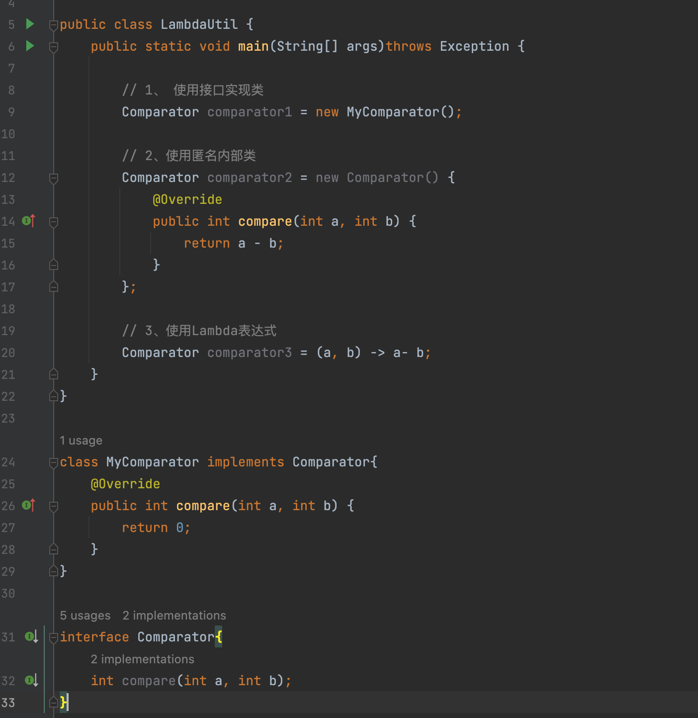 使用Lambda表达式可以对一个接口进行非常简洁的实现(如下图,分别是三种方式实现接口的对比)。