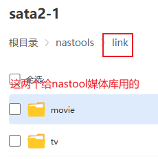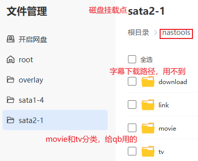 这里解释一下,/mnt/sata1-4/是内置的硬盘,比较小,存放软件配置。/mnt/sata2-1/nastools是另外一个大的硬盘,作为下载盘