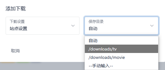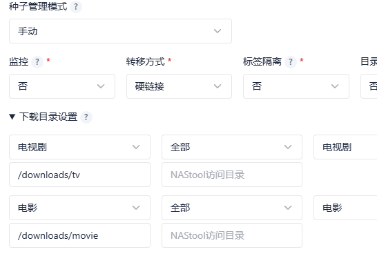 这里刚开始是懵的,不知道怎么设置,网上视频的nastool都是比较老的版本,我安装的是3.2.2 版本,弄了半天才理解,种子模式改为手动,就可以传递自己想要的分类下载路径给qb。这里还可以进行目录同步,没实验过,用的是nastool菜单的目录同步。